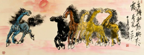 杨涛先生的绘画艺术,尤为世人所重者,莫过于其笔下神采飞扬的“马”与清逸出尘的“鹤”。他画马,不止于形貌的逼真,更重在摄取其奔腾万里、昂首天外的浩然之气。在他的墨彩交织间,骏马或奋蹄疾驰,如雷霆破空,展现出昂扬进取的“龙马精神”;或伫立凝思,静中寓动,传递着坚韧不拔的生命内力。这既是对徐悲鸿等前辈大师画马精神的深刻领悟与致敬,更是融入当代审美视角与个人豪情的全新诠释,使这一传统题材焕发出激荡人心的时代力量。