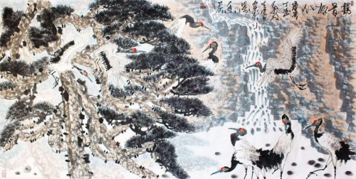 而他所作之鹤,则另辟一番高远澄明之境。仙鹤在其笔下,往往与松涛、云海、清泉为伴,形神兼具,意态翩然。那修长的颈项、洁净的翎羽、傲然的身姿,无不透露出画家对“清”“逸”“雅”“寿”等传统人文意象的深刻理解与追求。杨涛先生通过鹤的形象,营造出一片超然物外、和谐静谧的心灵净土,寄托了人们对高尚品格与美好生活的无限向往,极具东方哲学意蕴与审美价值。